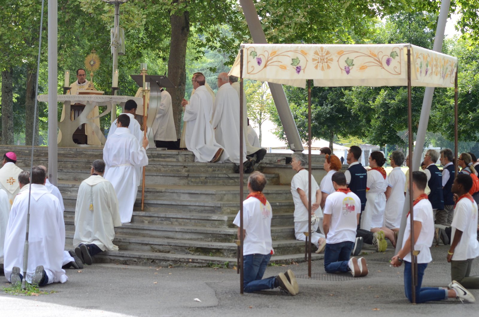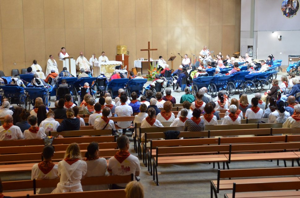 C’est vers 10h30 qu’ils ont débuté le premier temps fort de cette journée en se rendant à la Chapelle Sainte Bernadette pour la messe de l’Hospitalité. C’est toujours un moment important du pèlerinage ! Une année sur deux, les malades le souhaitant peuvent y recevoir le sacrement des malades. C’est aussi durant cette messe que l’on présente au Seigneur les naissances, mariages et malheureusement décès touchant de près ou de loin l’Hospitalité.